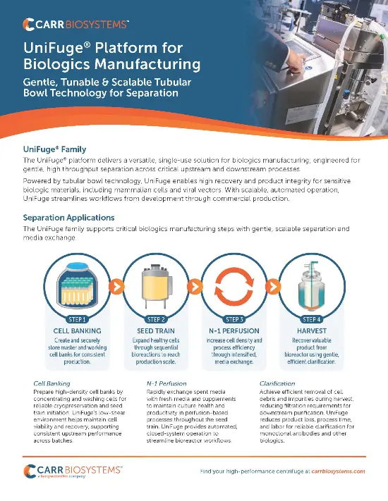 The UniFuge family provides low-shear separation, high-recovery performance, and fast processing times in three scalable models: UFMini, UniFuge Pilot, and U2k. With a variety of bowl sizes and flow rates ranging from 29 ml/min to 20 L/min, the UniFuge family of single-use separation systems offer both scalability and process efficiency in an aseptic closed system. The UniFuge Pilot was the industry pioneer in single-use centrifuge separation technologies. In 2021 CARR Biosystems released the UFMini to better support customers with a need for smaller scale processing using single-use technology.